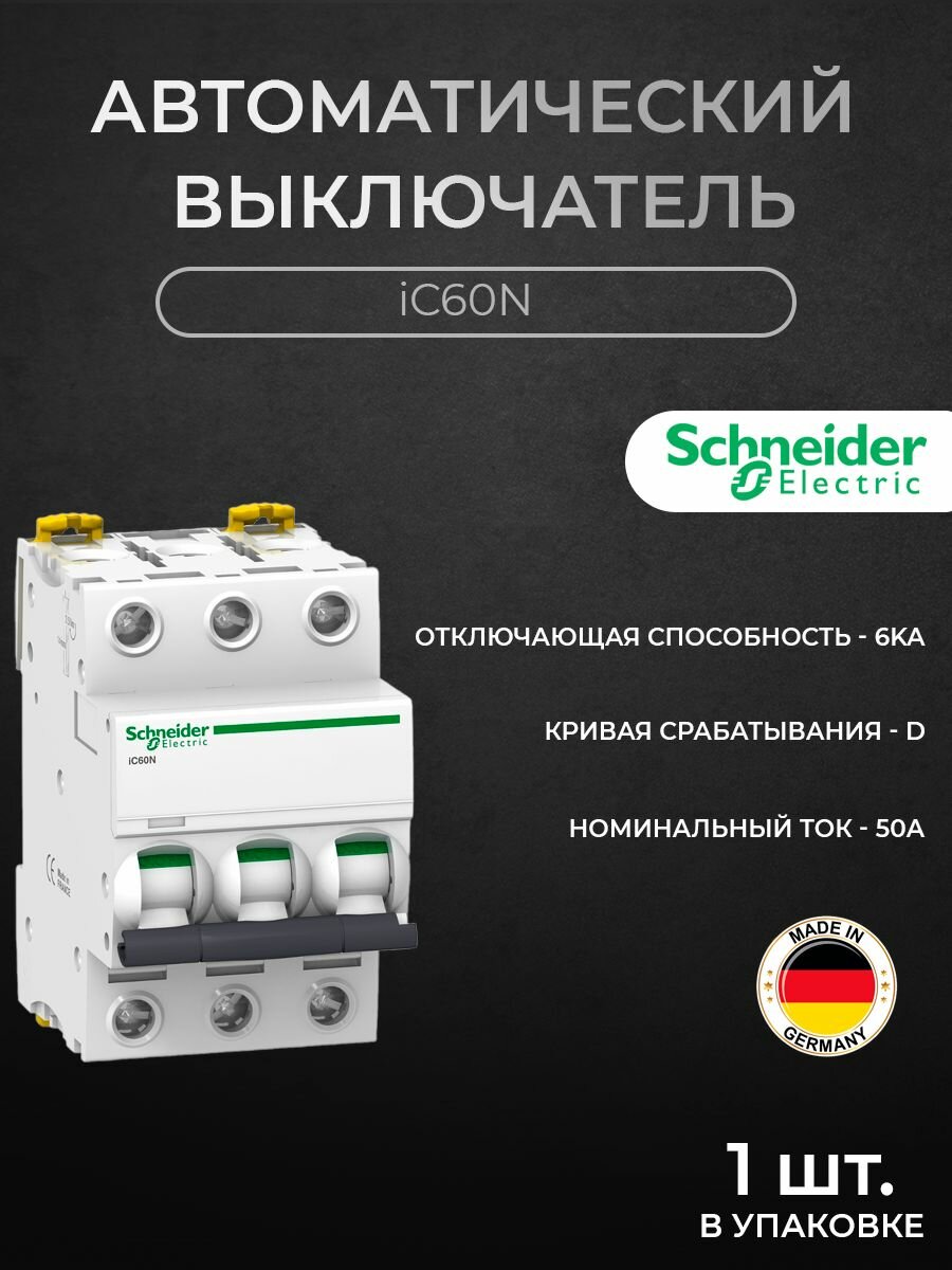 iC60N 3P 50А Автоматический выключатель 3-полюсный, 50А, 6кА (хар-ка D) Schneider Electric, A9F75350 информация: