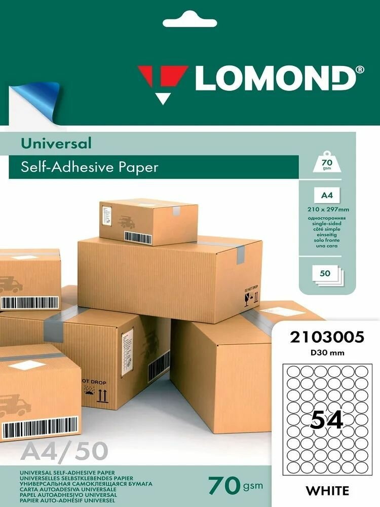 Самоклеящаяся бумага Lomond 2103005 универсальная, А4, 50 листов, 54 деления круглые 30 мм, 70 г/м2 информация: