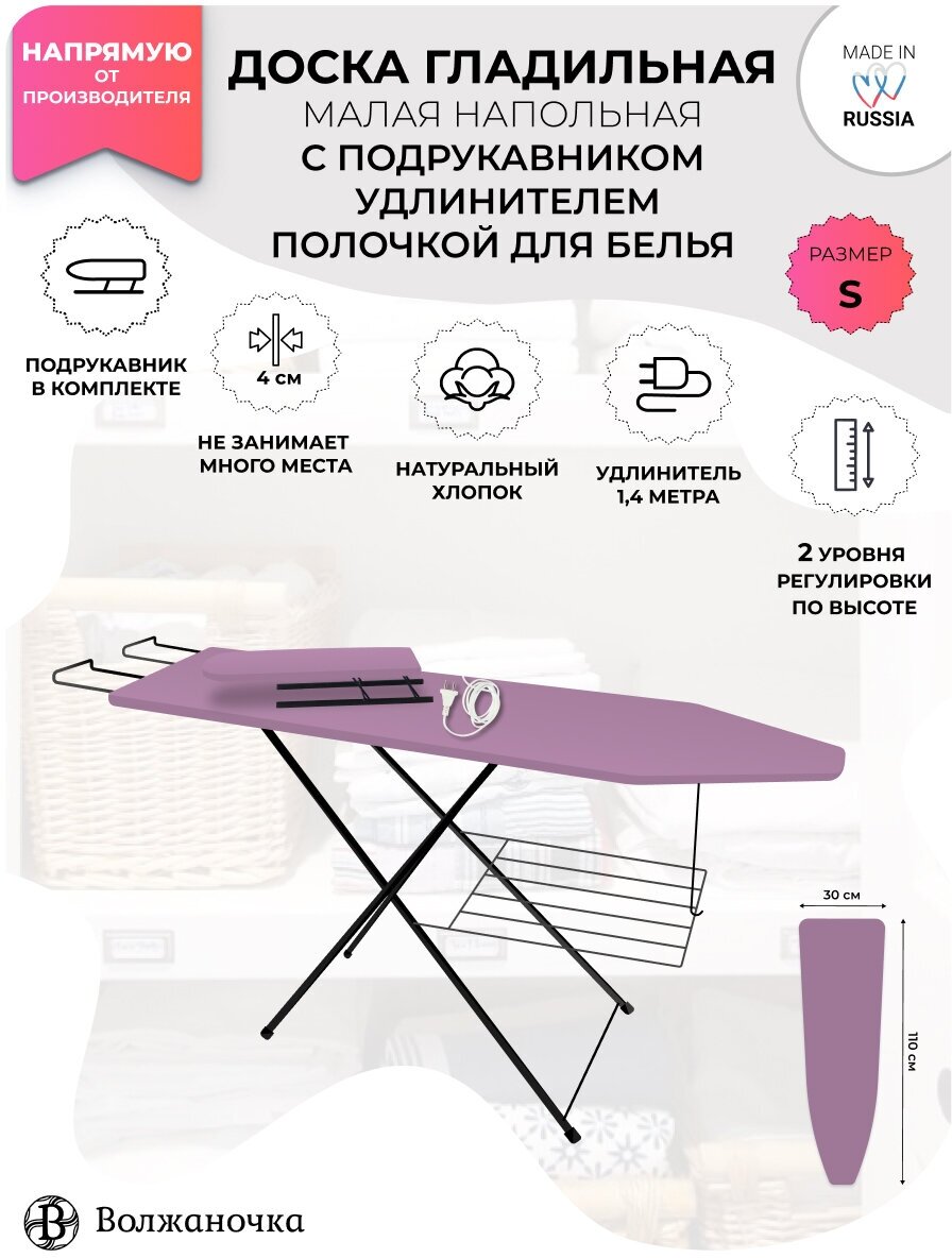 10 цен на Волжаночка Доска гладильная напольная складная с подрукавником, подставкой для утюга, полочкой для белья, розеткой и удлинителем, размер 110х30 см., цвет фиолетовый