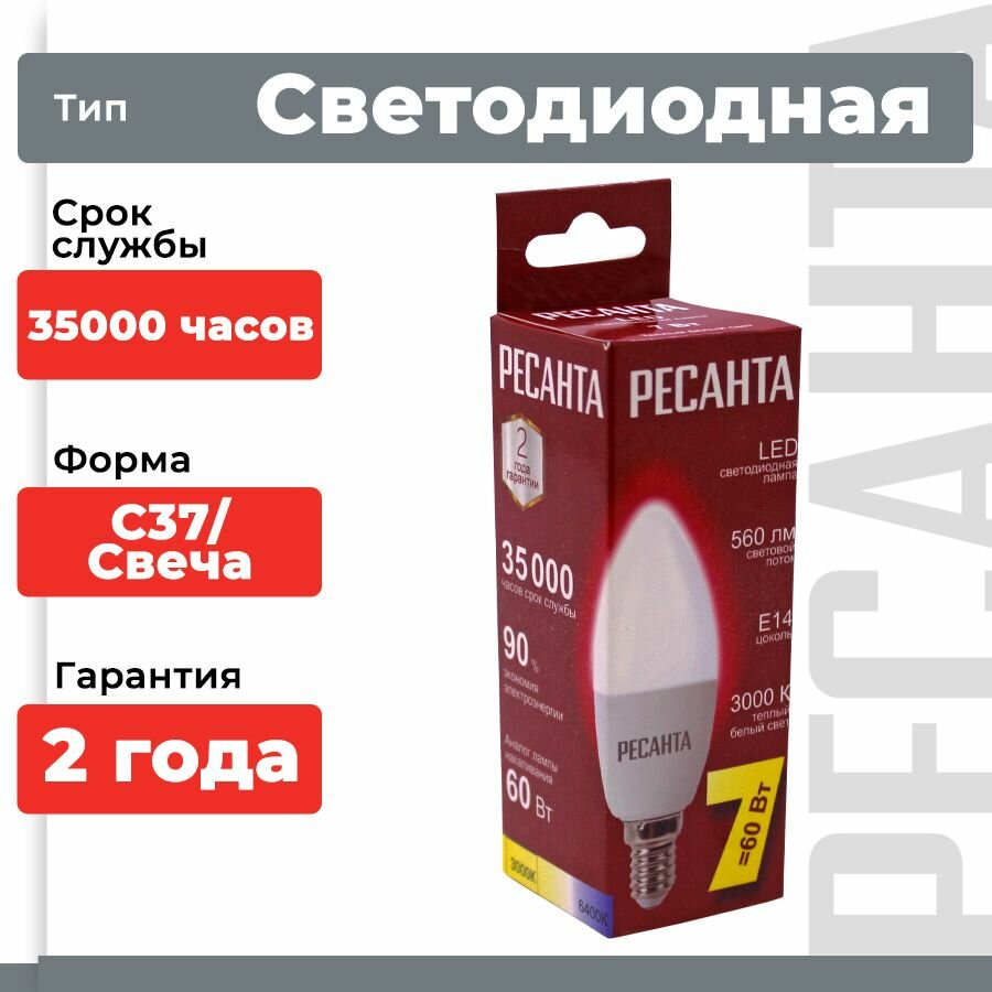 Лампочка светодиодная LL-R-C37-7W-230-3K-E14 (свеча, 7Вт, тепл. Е14) Ресанта информация: