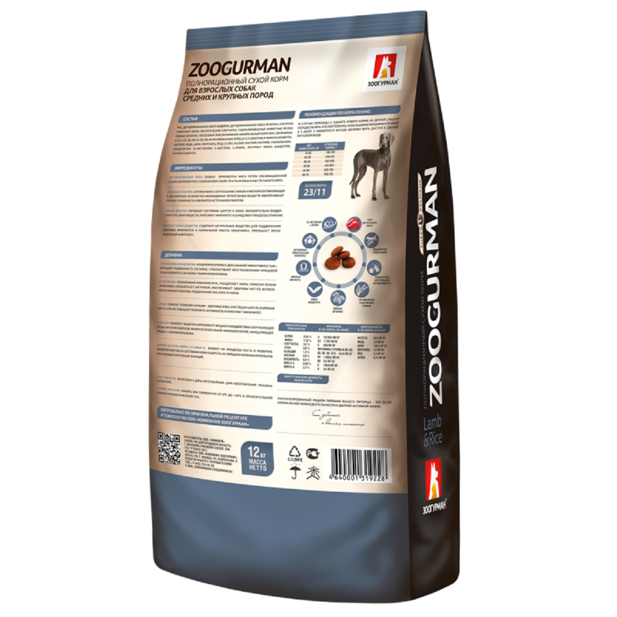 ZOOGURMAN SENSITIVE для взрослых собак средних и крупных пород при аллергии с ягненком и рисом (12 кг)