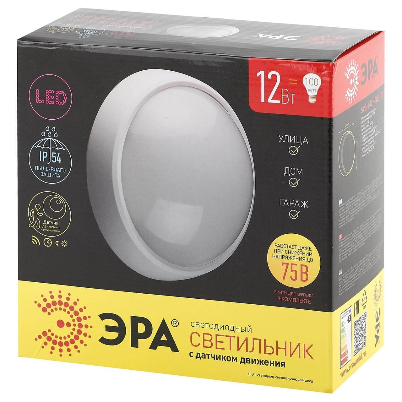 | Дополнительная информация | Светодиодный светильник с датчиком движения ЭРА 12Вт IP54 4000К SPB-1-12-MWS (W) |