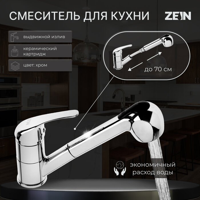10 цен на Смеситель для кухни ZEIN ZC2041, однорычажный, картридж 35 мм, с выдвижной лейкой, хром