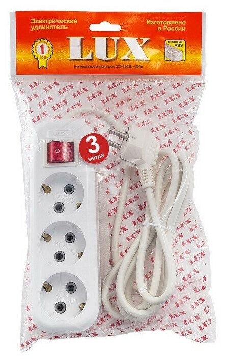 Удлинитель LUX У3-О, 3 розетки, 2 м, б/з, 10А / 2200 Вт