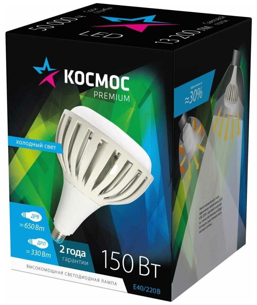 Лампа светодиодная КОСМОС Premium 6500K, E40, GX53, 150 Вт, 6500 К информация:
