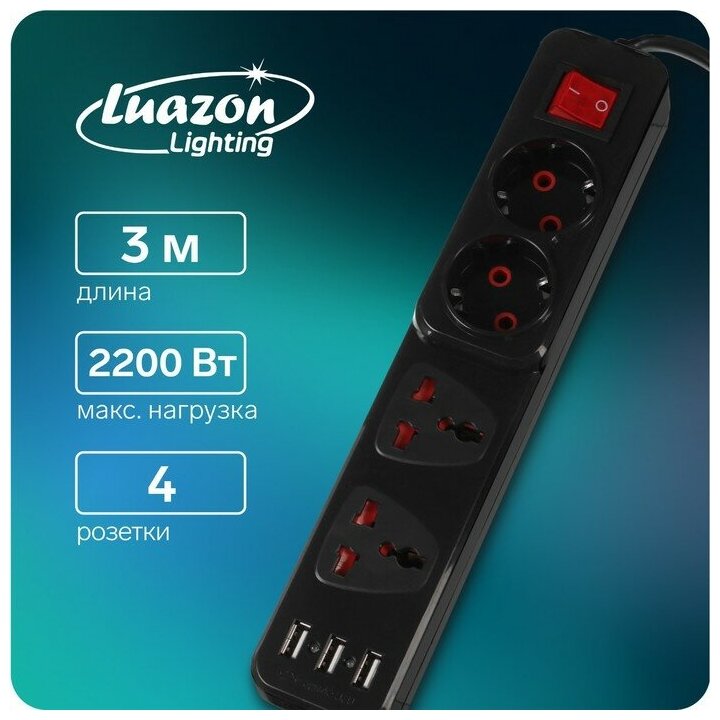 Удлинитель Luazon Lighting 2 евро, 2 универсальные, 3 м, 3хUSB, с выключателем, черный информация: