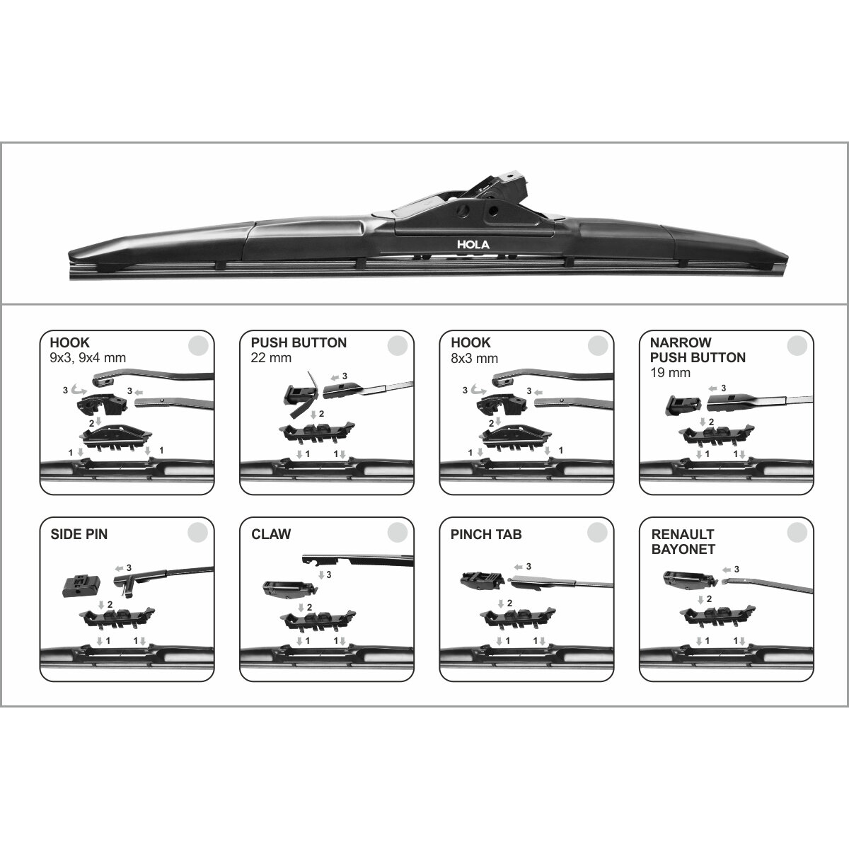HOLA HQ21 Щетка стеклоочистителя гибридная адаптеры (крючок,side pin,top lock,pinch tab,bayonet,push button,claw,slim top) 530mm HQ21