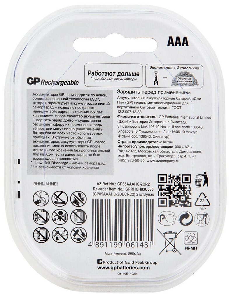 Перезаряжаемые аккумуляторы GP 85AAAHC AAA, емкость 850 мАч - 2 шт. в клемшеле GP 4891199061431 информация: