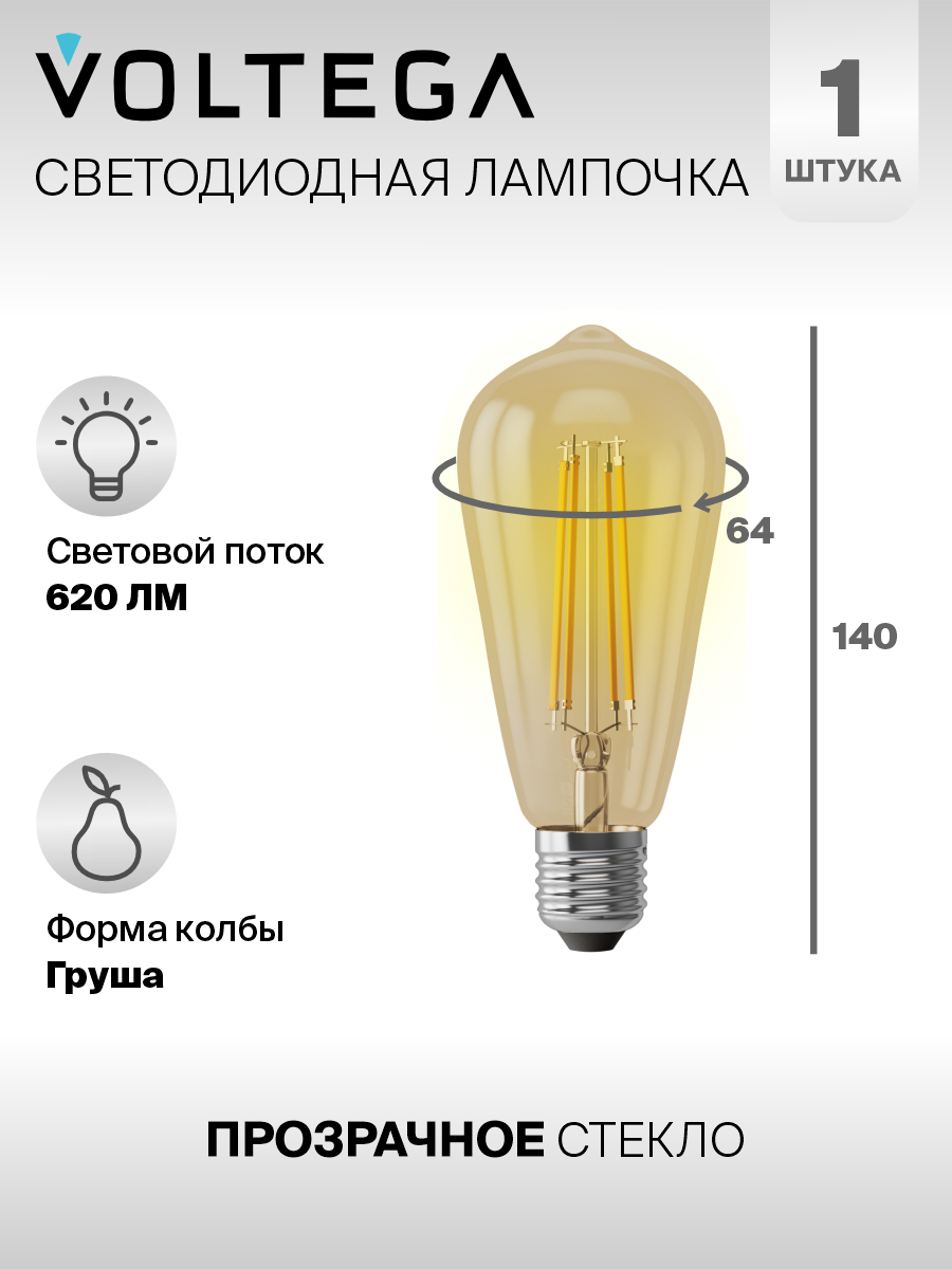 Светодиодная лампочка Е27 в стиле лофт форма груша 6W теплый свет Voltega Loft 2800К 1 штука 390 ₽