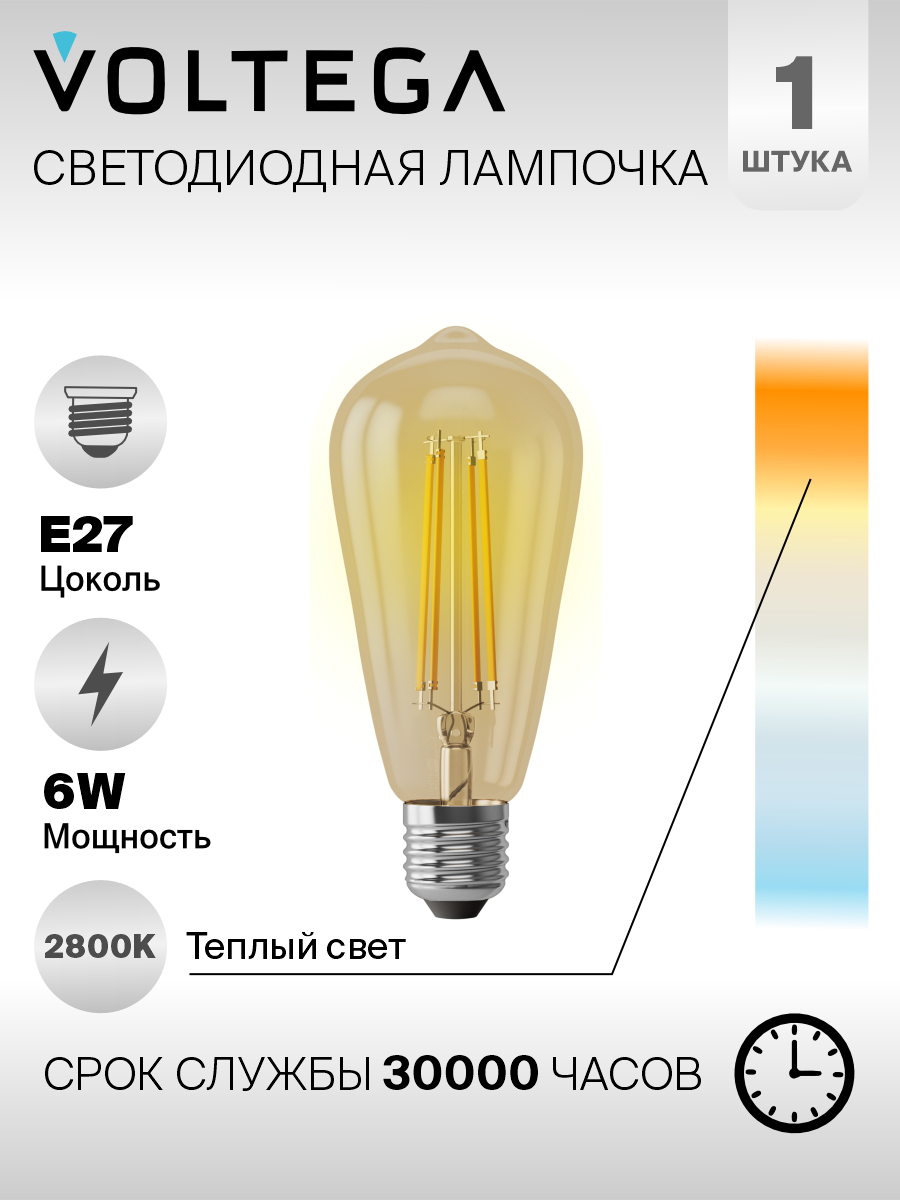 VOLTEGA Лампа светодиодная филаментная Voltega E27 6W 2800К золотая VG10-ST64Gwarm6W 5526 500 ₽