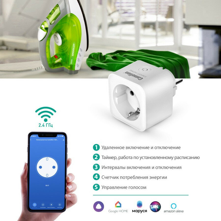 Умная Wi-Fi розетка Camelion Smart Home 16A 4000W c заземлением, выключатель, таймер, счетчик, управление голосом/смартфоном