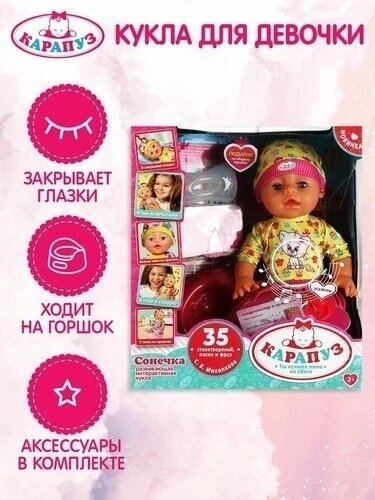 Пупс Карапуз "Сонечка", озвученный, стихи С. Михалкова, 35 см, пьет, писает, закрывает глаза, 4 аксессуара (Y35BB-DP-22-RU) информация: