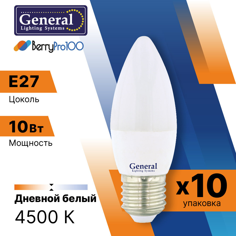 (10шт)Лампочка светодиодная 10Вт свеча 4500К General 683100 GLDEN-CF-10-230-E27-4500 информация: