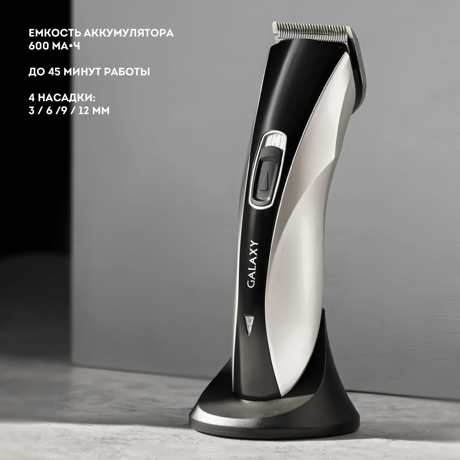 GALAXY GL 4155 Набор для стрижки , лезвия из японской нержавеющей стали, индикатор работы и заряда, время непрерывной работы 45мин, 4насадки – расчески (3,6;9;12мм), филировочный гребень, эргономичный дизайн, питание 220-240В ,50Гц