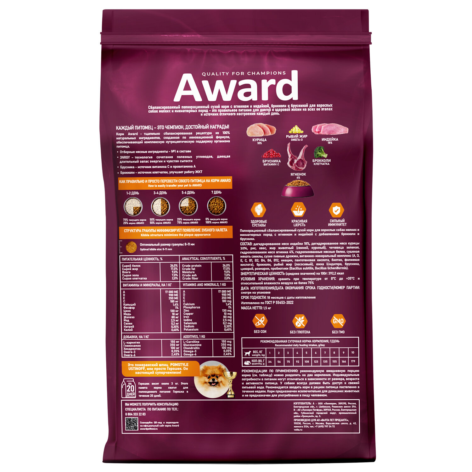 Сухой корм AWARD для взрослых собак мелких и миниатюрных пород с ягненком и индейкой с добавлением брокколи и брусники 800г информация: