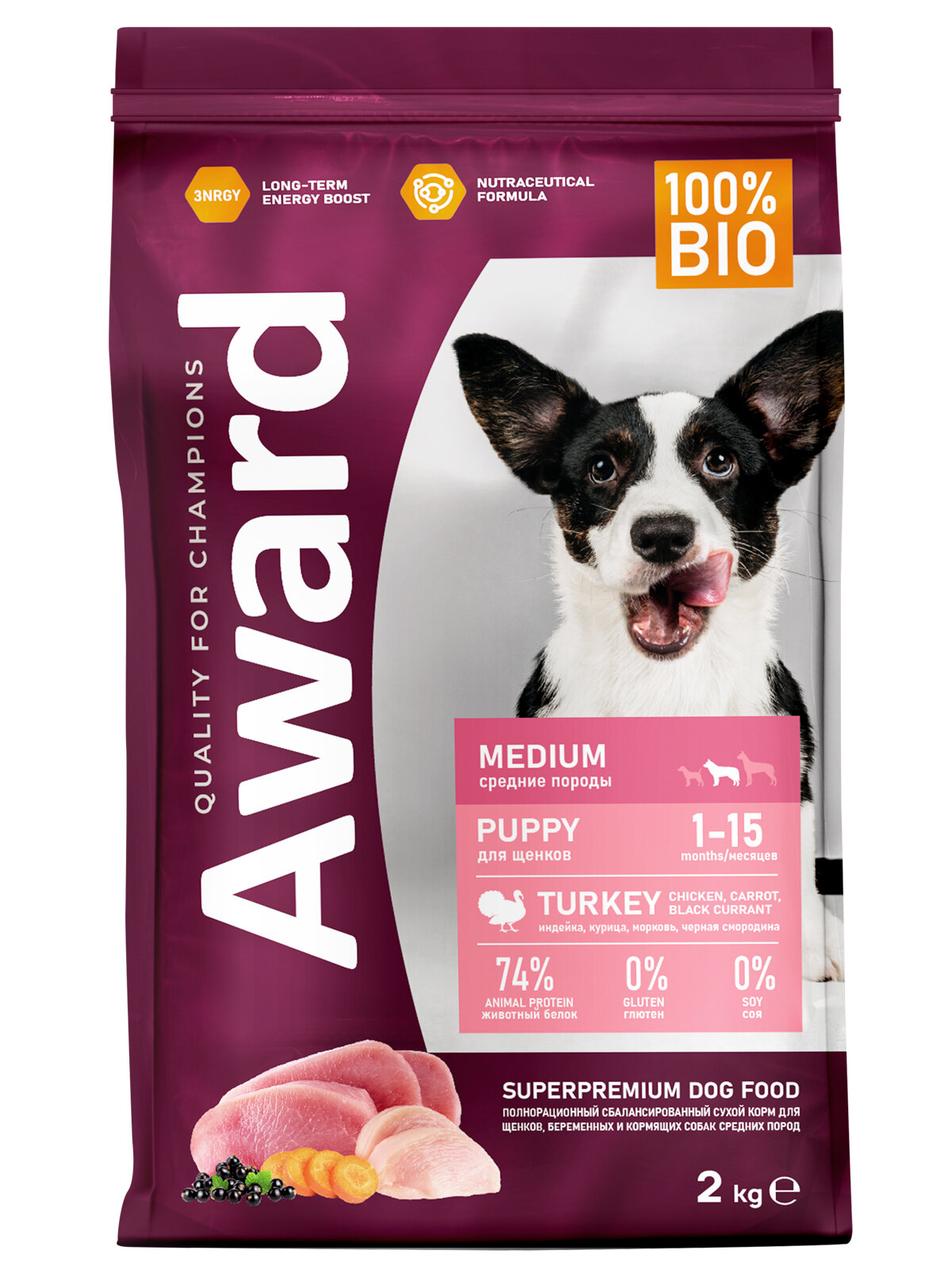 Сухой корм AWARD для щенков от 1 мес, беременных и кормящих сук средних пород с индейкой и курицей с добавлением моркови и черной смородины 2кг информация: