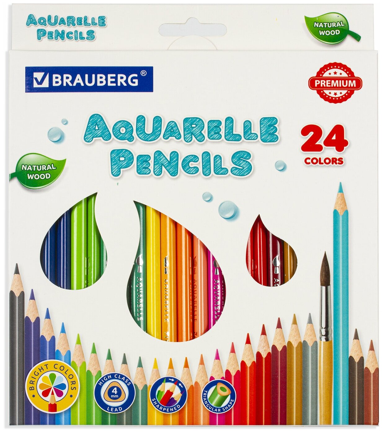 Карандаши цветные акварельные BRAUBERG PREMIUM AQUARELLE, 24 цвета, грифель мягкий 4 мм, 181673 (арт. 181673)