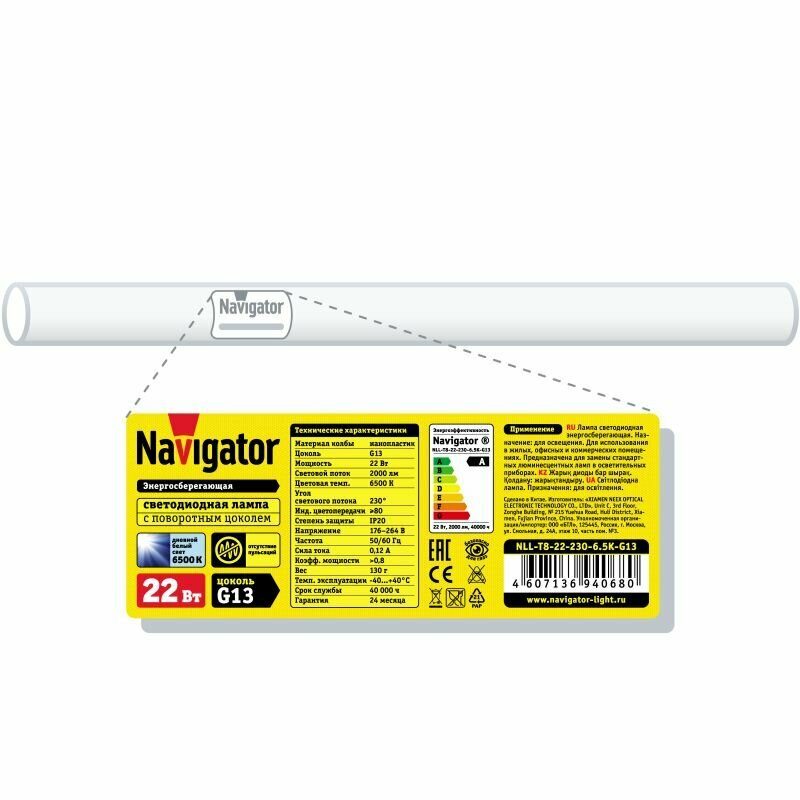 Лампа светодиодная 94 068 NLL-T8-22-230-6.5K-G13 22Вт линейная 6500К холод. бел. G13 2000лм 176-264В поворотный цоколь Navigator 94068 информация: