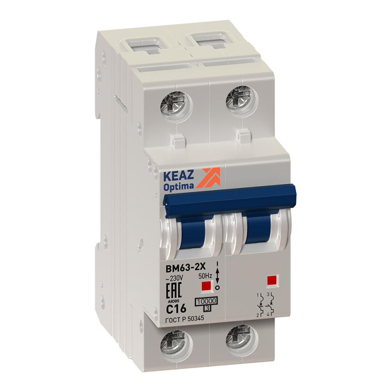 Выключатель автоматический модульный 2п C 63А 6кА OptiDin BM63-2C63-УХЛ3 | код 260610 | КЭАЗ (1 шт.)