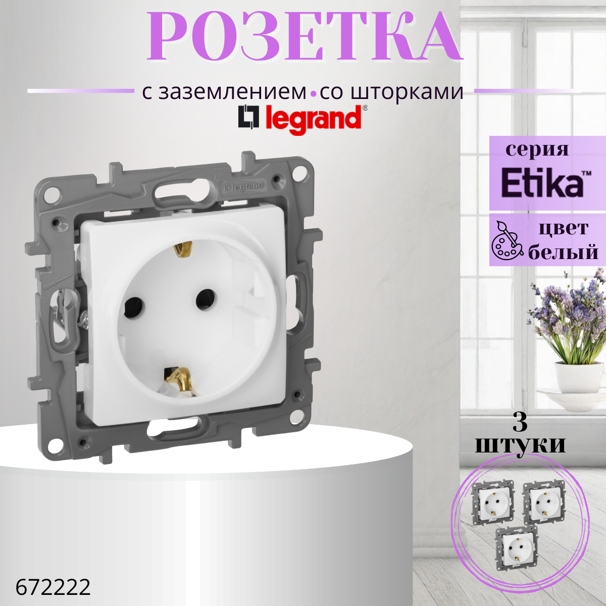 3шт. - ETIKA Розетка с заземлением со шторками белая / Legrand; арт. 672222; оригинал / - комплект 3шт 1 101 ₽