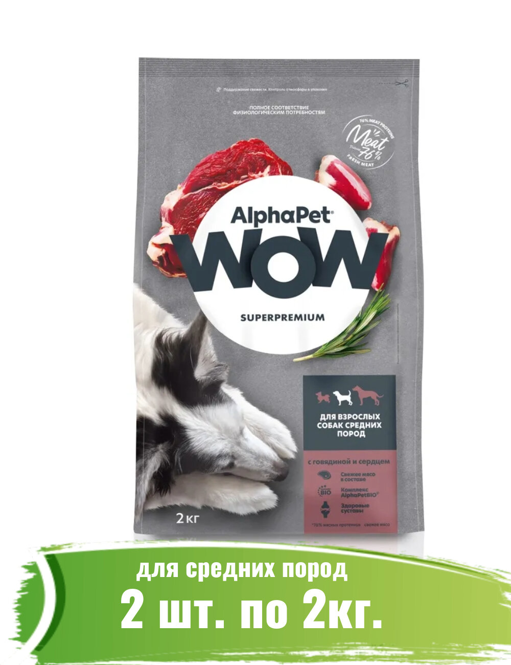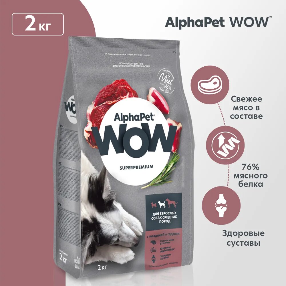 AlphaPet WOW (АльфаПет) корм сухой для собак средних пород с говядиной и сердцем 2уп по 2кг информация: