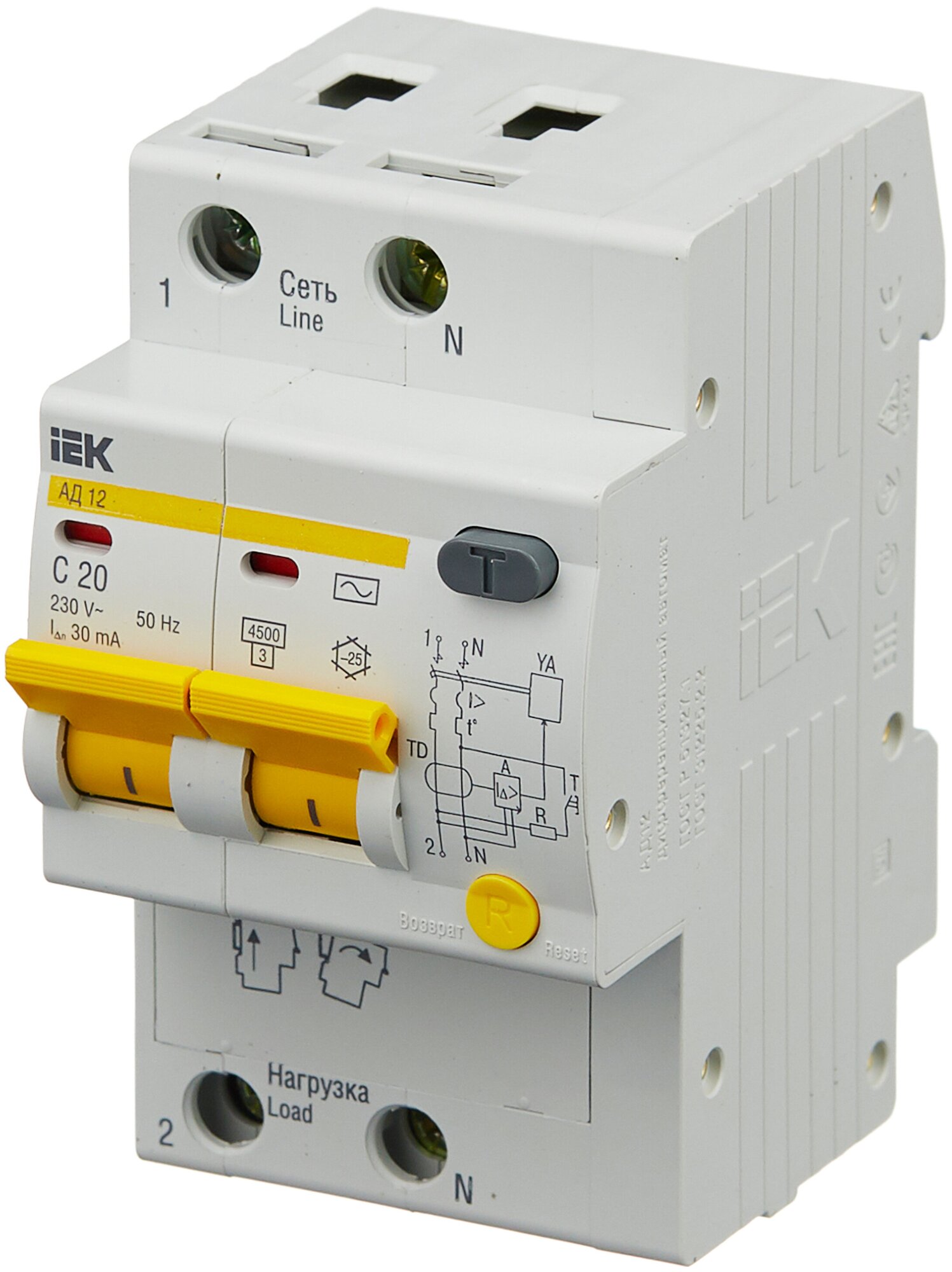 Дифференциальный автоматический выключатель двухполюсный IEK АД12 20А, 30мА, тип AC, характеристика C