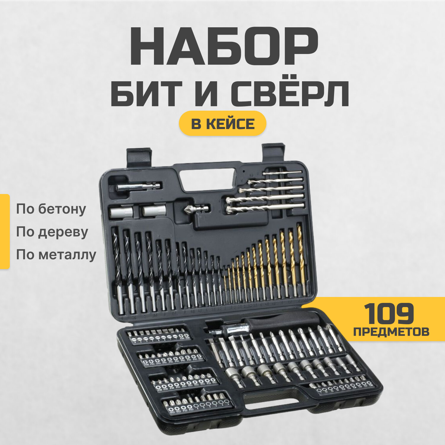 | Биты подробно | Биты L=25мм: PH0(3 шт), PH1(3 шт), PH2(3 шт), PH3(3 шт), PZ0(3 шт), PZ1(3 шт), PZ2(4 шт), PZ3(4 шт), SL4(2 шт), SL5(2 шт), SL6(2 шт), SL7(4 шт), T10, T15, T20 , T25, T27, T30, биты под квадрат S1, S2, S3; Биты L=50мм: PH1, PH2(2 шт), PH3, PZ1, PZ2, PZ3, H4(2 шт), H5(2 шт), H6(2 шт), H7, SL6, SL8, SL10. |