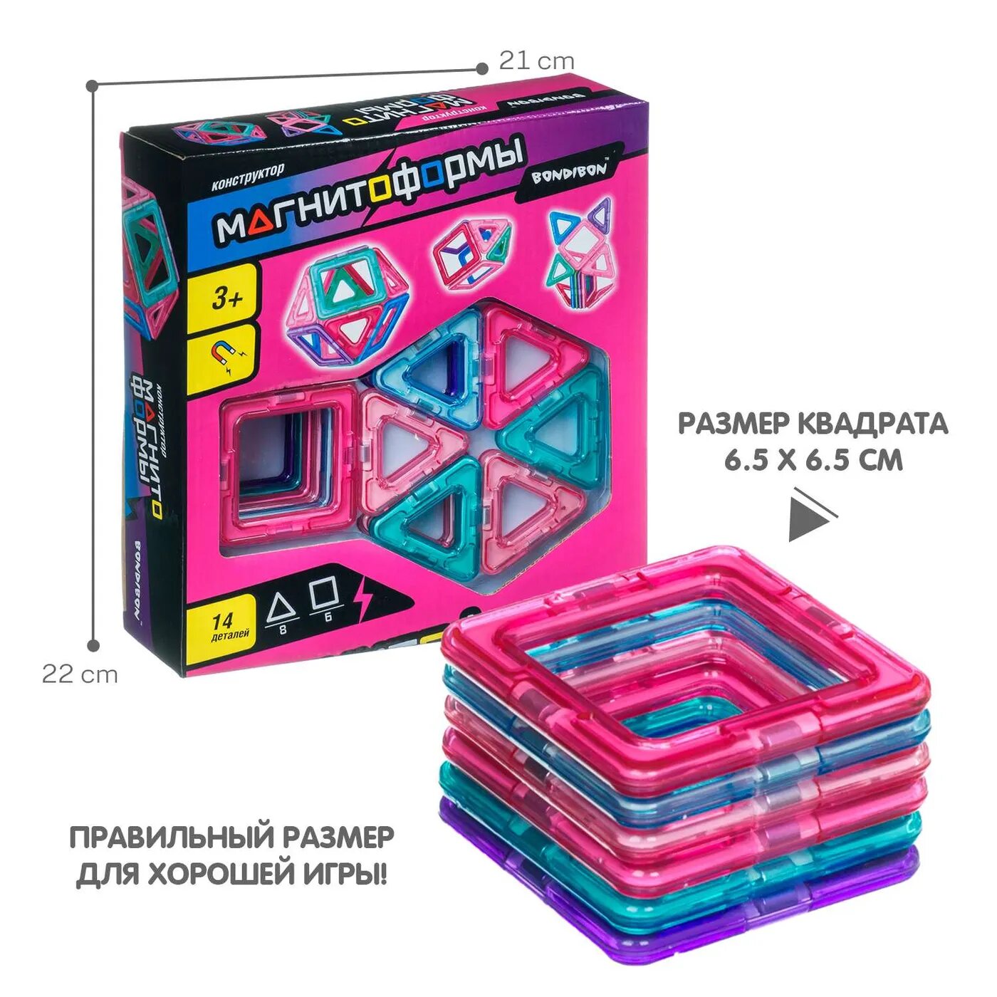 Магнитный конструктор магнитоформы Bondibon, набор 14 дет. (6 квадратов, 8 треугольников), ВОХ 21х22