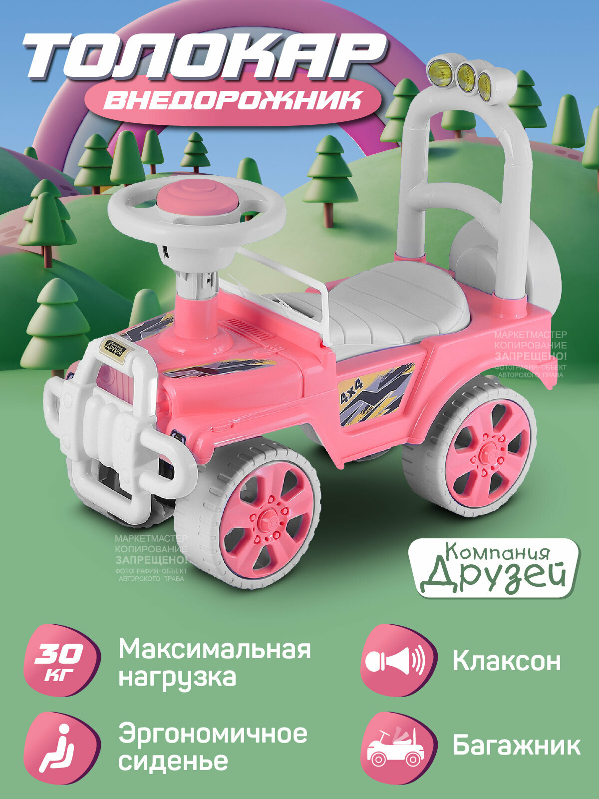 10 цен на Каталка детская толокар ТМ Компания Друзей, внедорожник, джип, пушкар, пластиковые колеса, высокая спинка, багажник, розовый, JB5300680