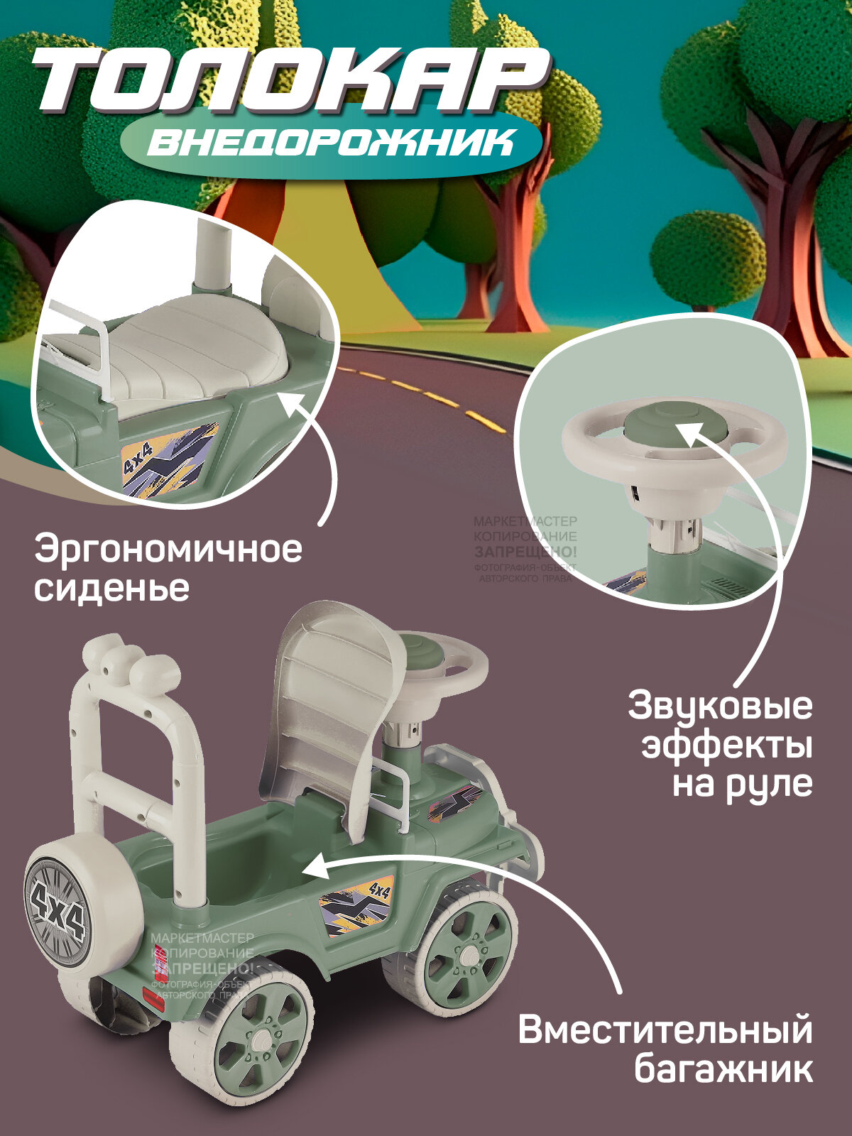 Каталка детская толокар ТМ Компания Друзей, внедорожник, джип, пушкар, пластиковые колеса, высокая спинка, багажник, зеленый, JB5300679 информация: