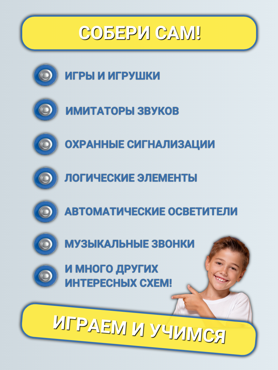 Дополнительная информация | 180 схем, размер коробки 41х27,5х3,5 см, для работы схем необходимы 4 батареи (приобретаются отдельно) размера АА, напряжением 1,5 V, или аккумуляторы аналогичного размера, напряжением 1.2 V |