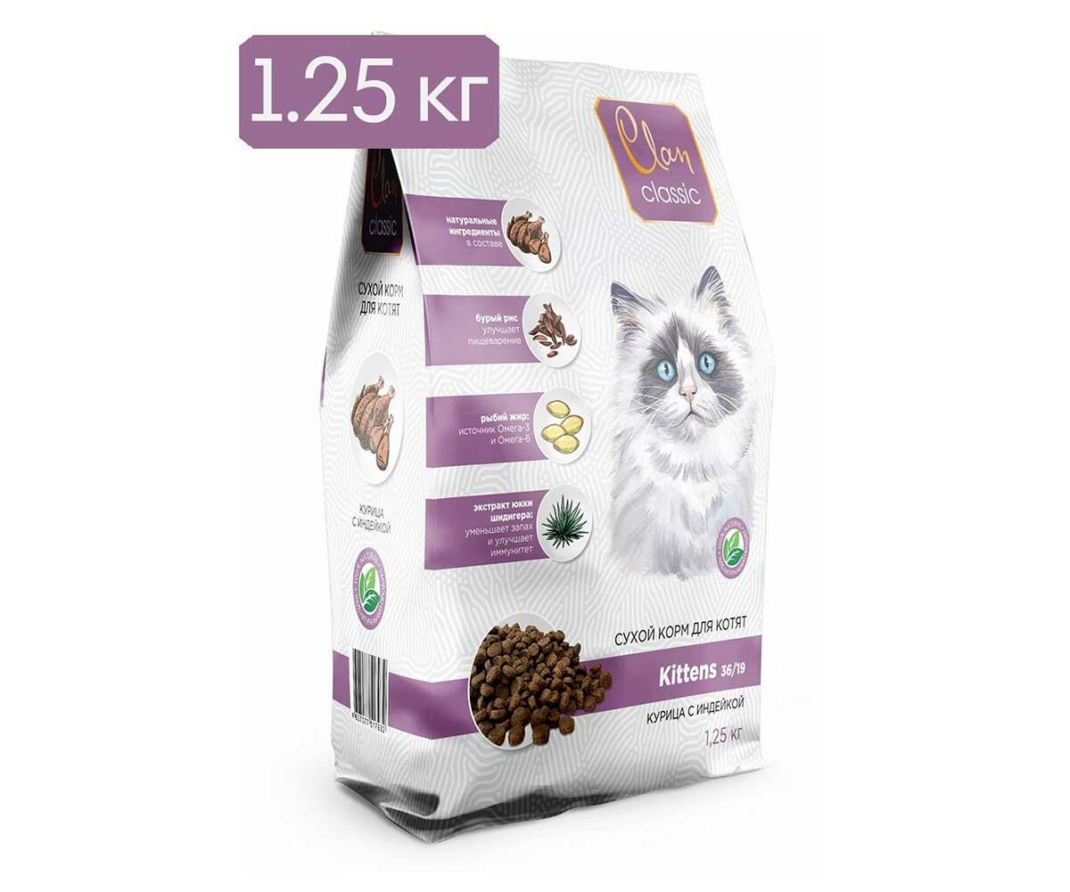 Сухой корм CLAN CLASSIC Kittens 36/19 для котят, курица с индейкой 1,25кг