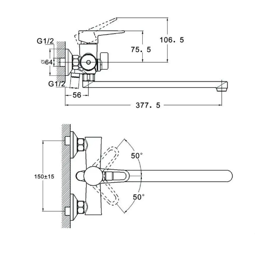 Смеситель на раковину настенный Эверест B46-350 с круглым поворотным изливом, кран-буксы 1/2", хром