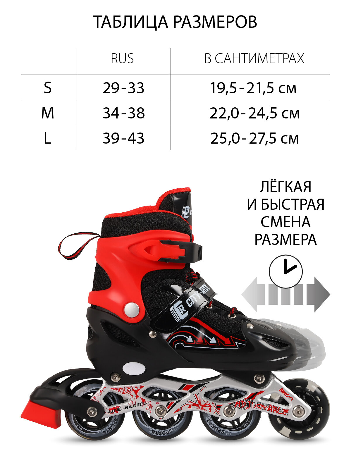 Роликовые коньки "CITY-RIDE" JB8800083, S (29-33 PU колеса, переднее колесо со светом, подшипники AB