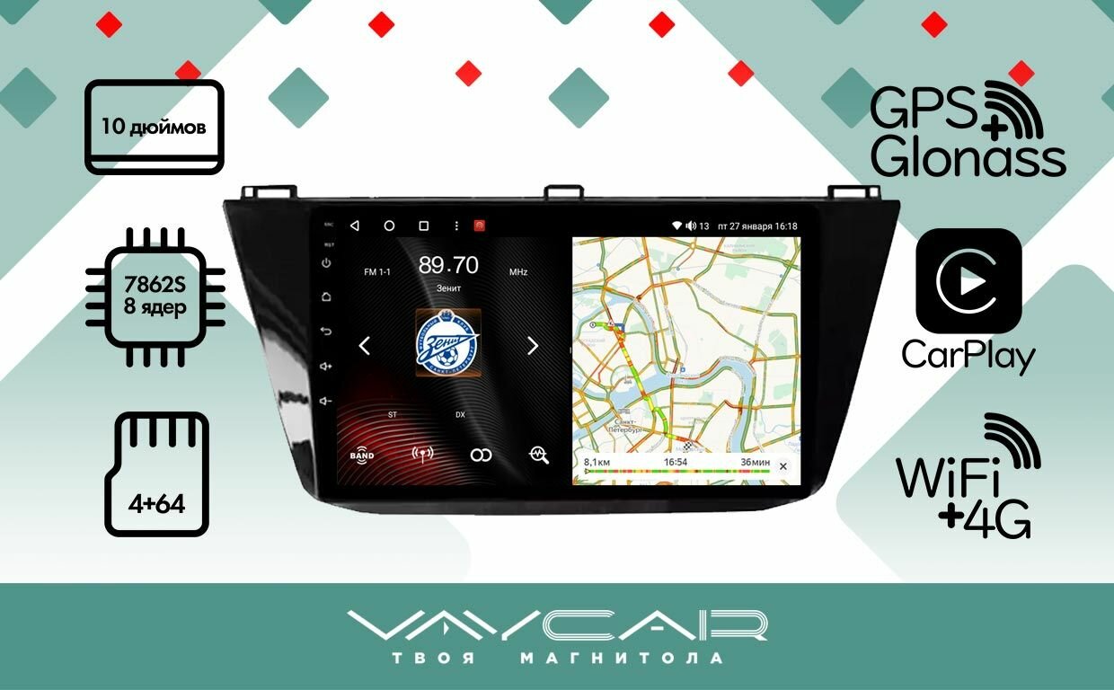 Магнитола Vaycar 10VO4 для VOLKSWAGEN Tiguan 2016+ (Андроид, 4+64, 8 ядер, WiFi, BT, 4G, GPS, QLED 10")