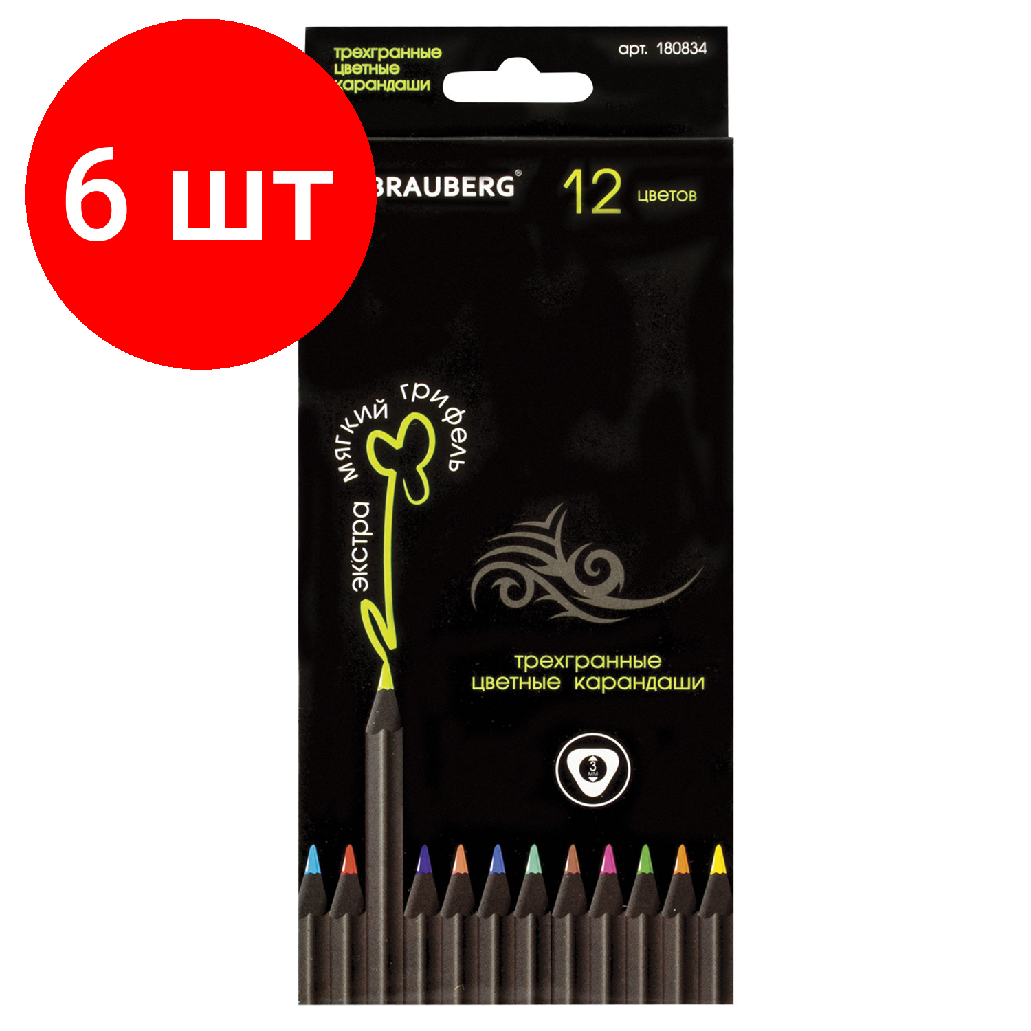 Комплект 6 шт, Карандаши цветные BRAUBERG "Black Jack", 12 цв., трехгранные, черное дерево, заточенные, картонная упаковка, 180834 информация: