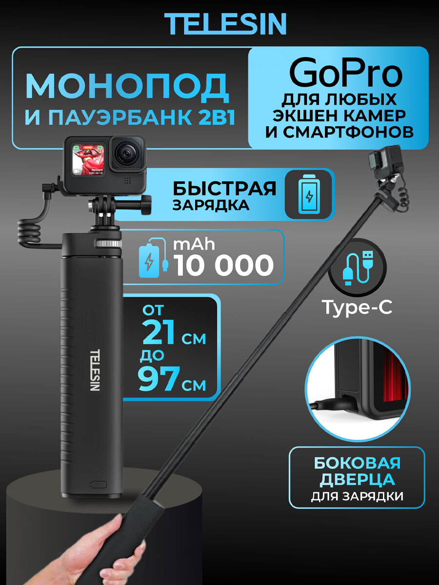 10 цен на Монопод-повербанк до 90 см 10000mAh Telesin Power Hand Grip для телефона или камеры