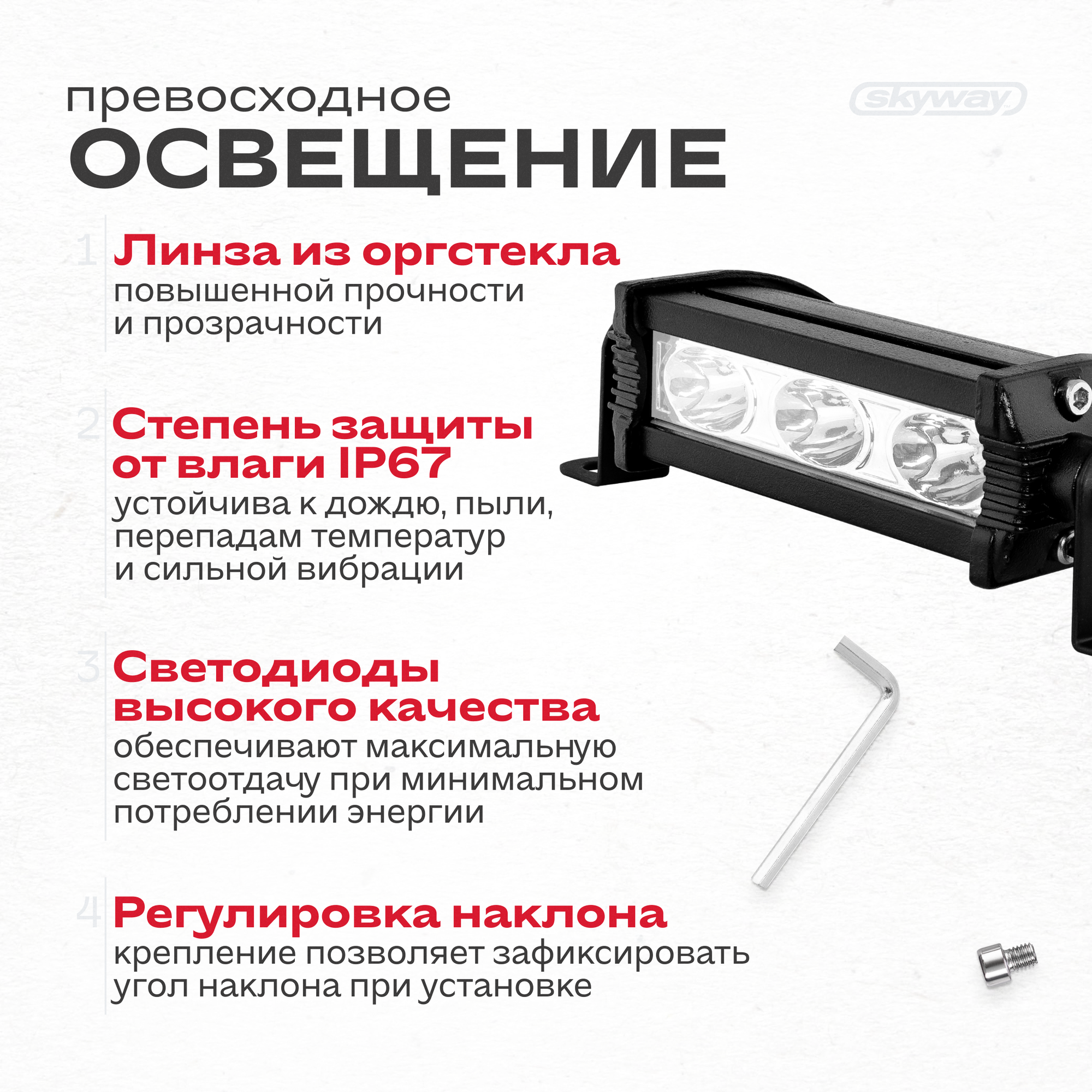 SKYWAY Фара светодиодная OFF ROAD 106*30мм прямоугольная 12V/24V 18W 6000К 3 Дальний свет S07201076