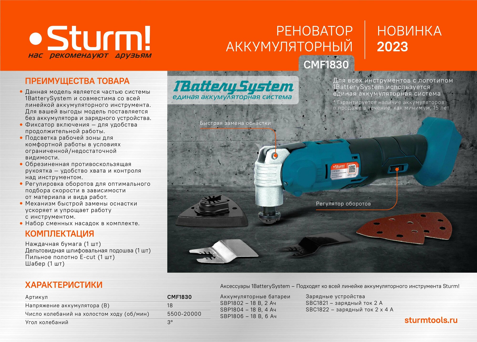 CMF1830 Реноватор аккумуляторный Sturm! 18 В, 1BatterySystem, 5500-20000 об/мин, без АКБ и ЗУ . 6 476 ₽