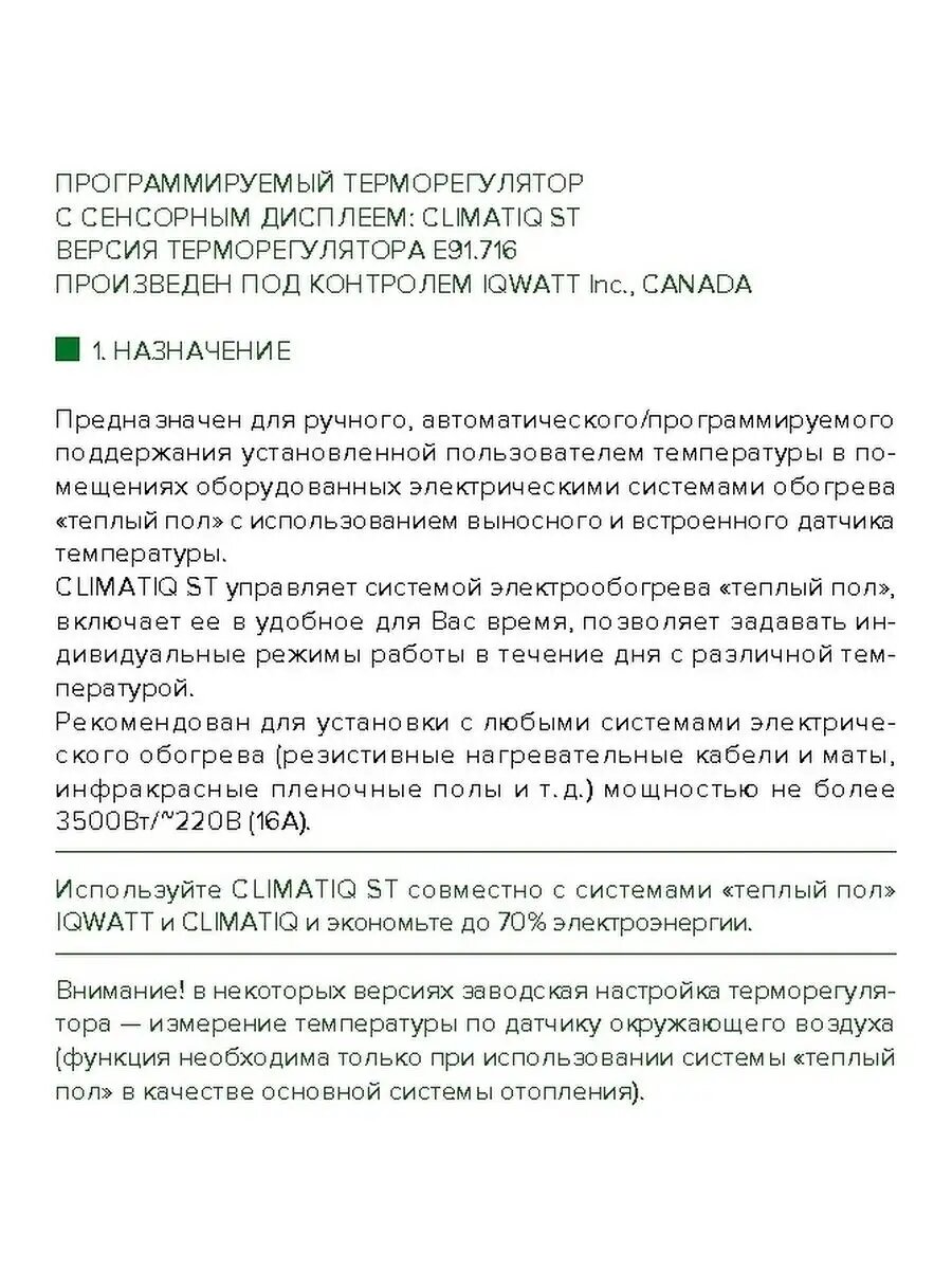 Терморегулятор Climatiq ST программируемый сенсорный информация:
