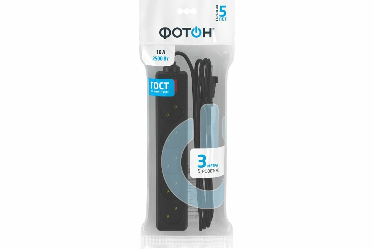 Фотон Удлинитель сетевой 10-35S, 3м, 5 розеток, 10А, с выключателем, Черный 22727 информация: