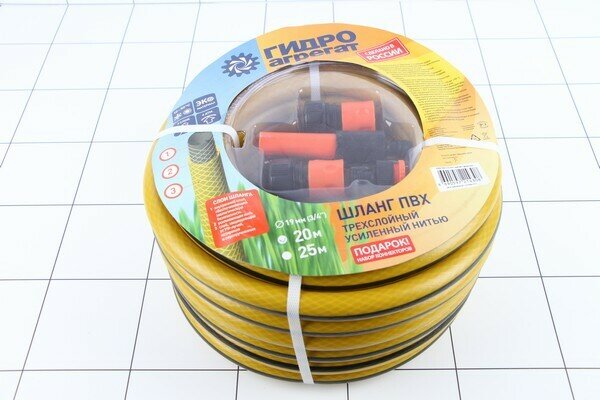 10 цен на Шланг поливочный ПВХ Гидроагрегат , d3/4 20м армир, с фитингами, желтый с черной полосой ,шт