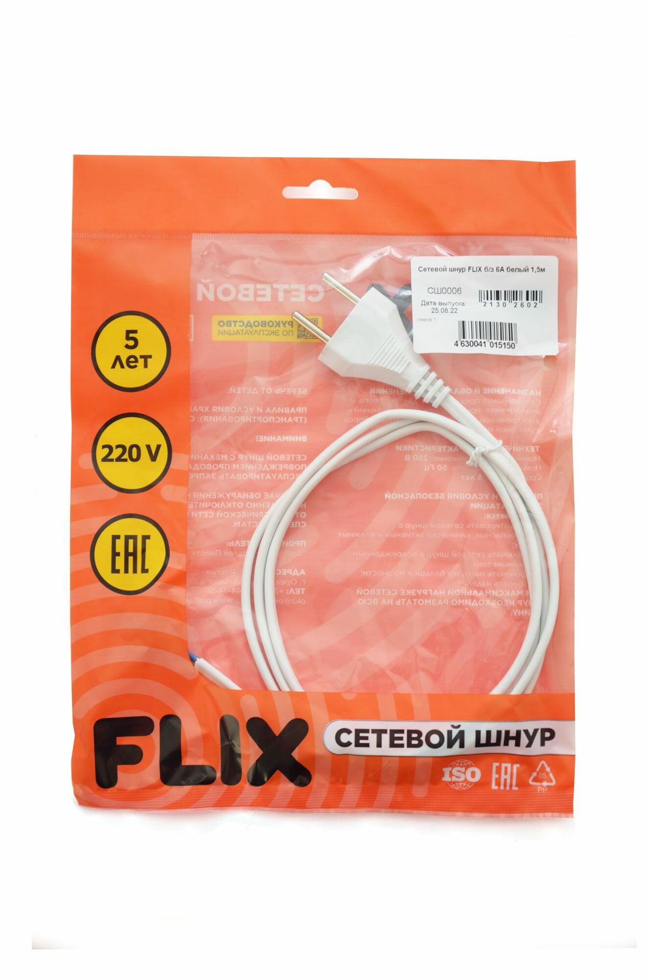 Сетевой шнур с вилкой без заземления 6А 1,5 м цвет белый FLIX информация: