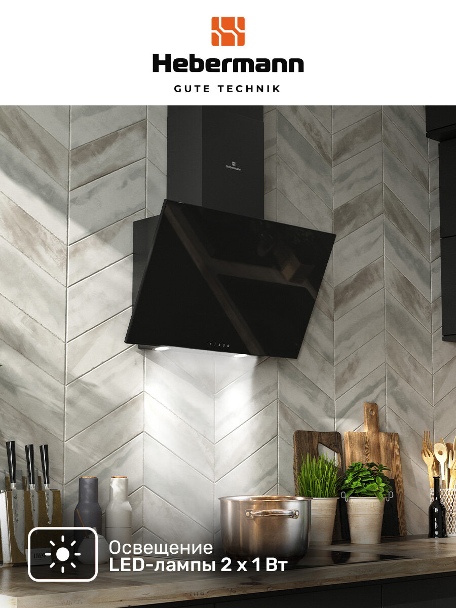 Наклонная кухонная вытяжка Hebermann HBKH 60.4 B, 60 см, черная, окрашенная сталь, стекло информация: