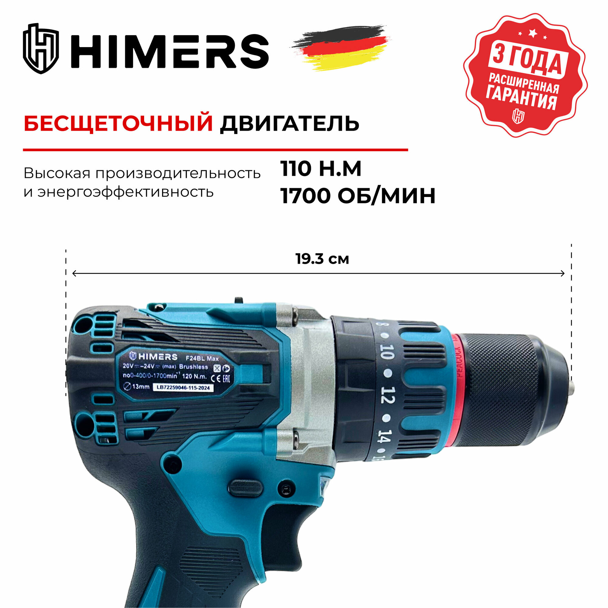 Ледоруб Бесщеточный шуруповерт HIMERS DF24BL MAX аккумуляторный 24V, 2 АКБ по 9 А.ч., 110 Н.м., Кейс / для сверления, закручивания 24в ледобур информация: