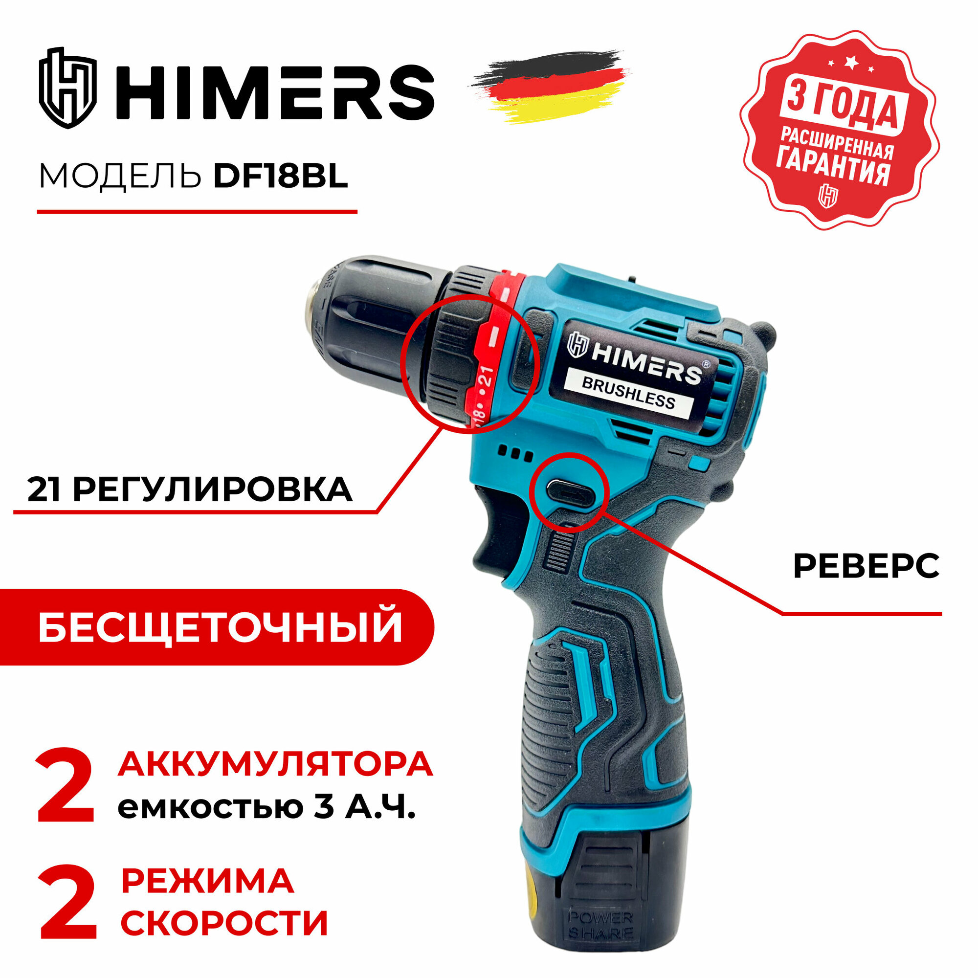 Отзывы на Бесщеточный шуруповерт HIMERS DF18BL аккумуляторный 18V, 2 АКБ по 3 А.ч., 60 Н.м., Кейс с набором бит, свёрел, головок инструментов 24 предмета / многофункциональный для сверления, закручивания 18в
