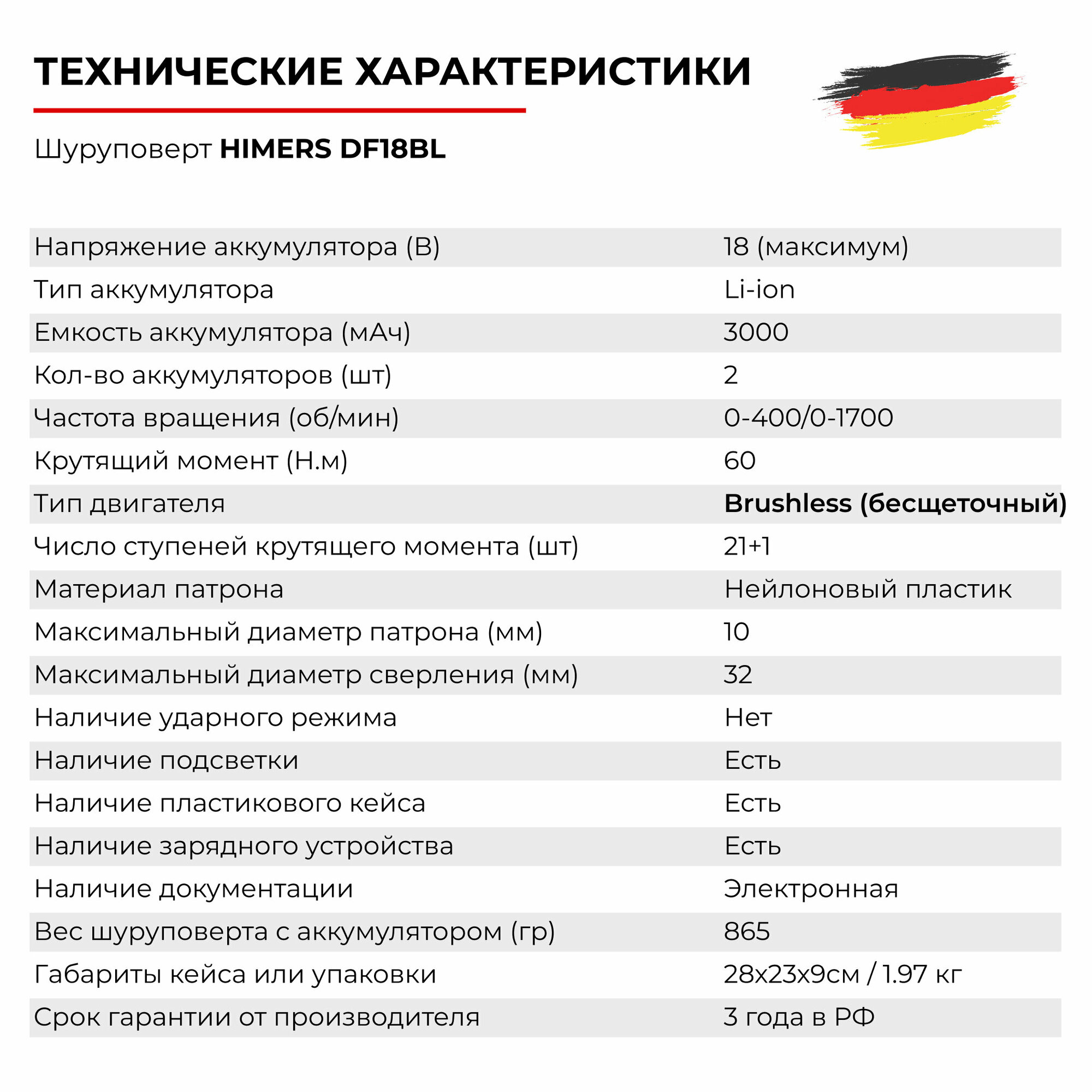 Бесщеточный шуруповерт HIMERS DF18BL аккумуляторный 18V, 2 АКБ по 3 А.ч., 60 Н.м., Кейс с набором бит, свёрел, головок инструментов 24 предмета / многофункциональный для сверления, закручивания 18в информация: