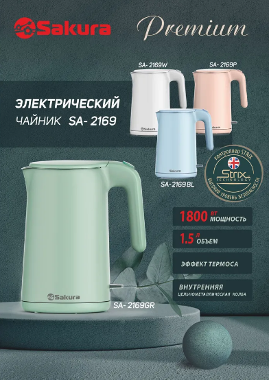 Чайник электрический Sakura SA-2169GR Premium фисташковый 1.5л