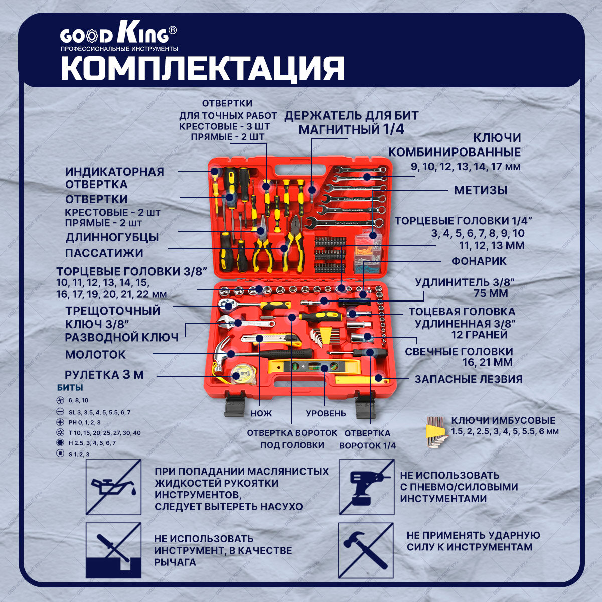 Набор инструментов, tools для дома, для автомобиля, GOODKING D-10063 шестигранные ключи, отвертки, комбинированные ключи, трещотка, торцевые головки, кейс информация: