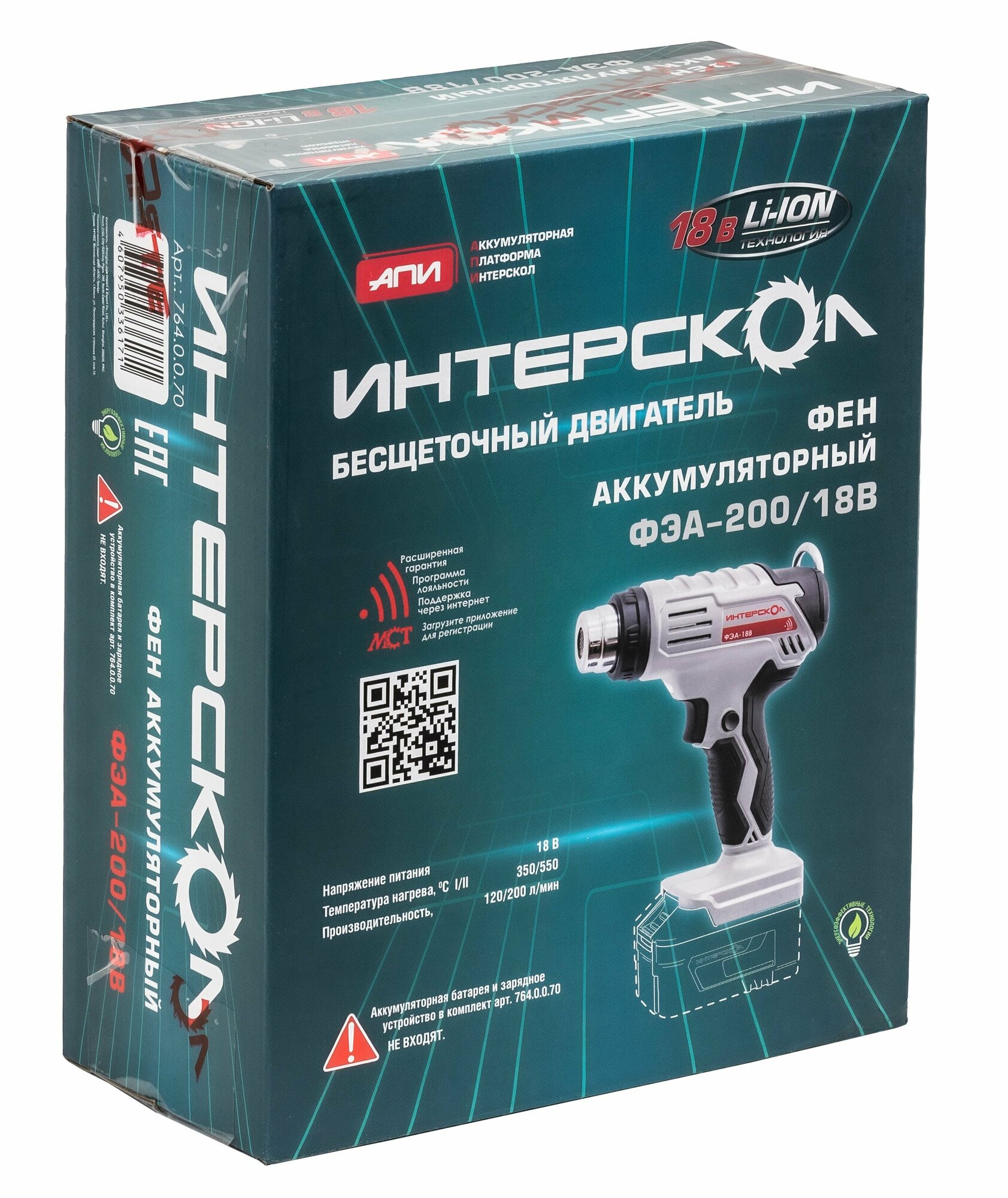 Фен технический ИНТЕРСКОЛ ФЭА-200/18В, арт. 764.0.0.70, (без АКБ и ЗУ), картон информация: